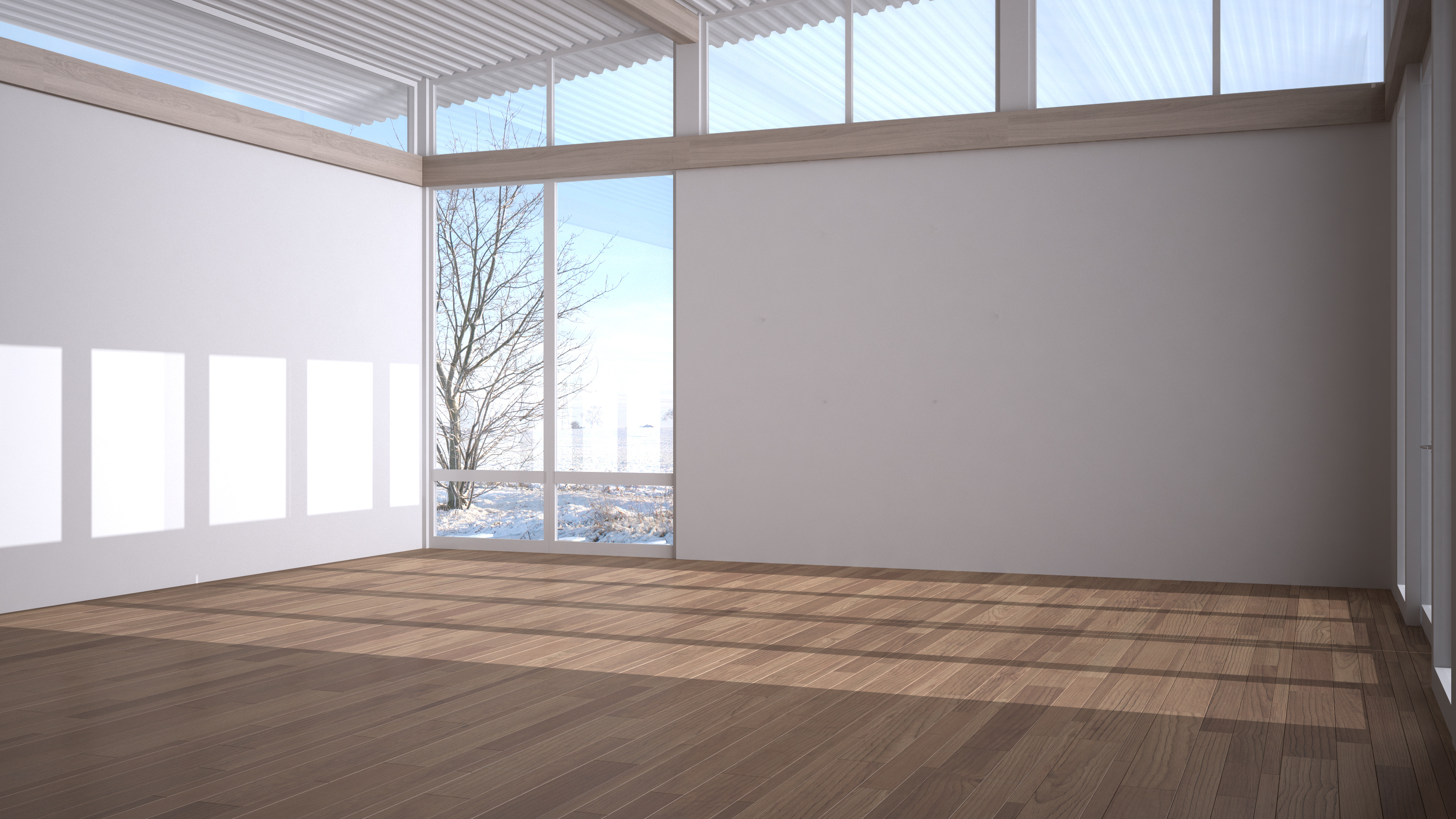 Empty room interior design, open space with big panoramic windows on winter view with snow, parquet wooden floor, corrugated sheet roof, modern minimal architecture idea, copy space