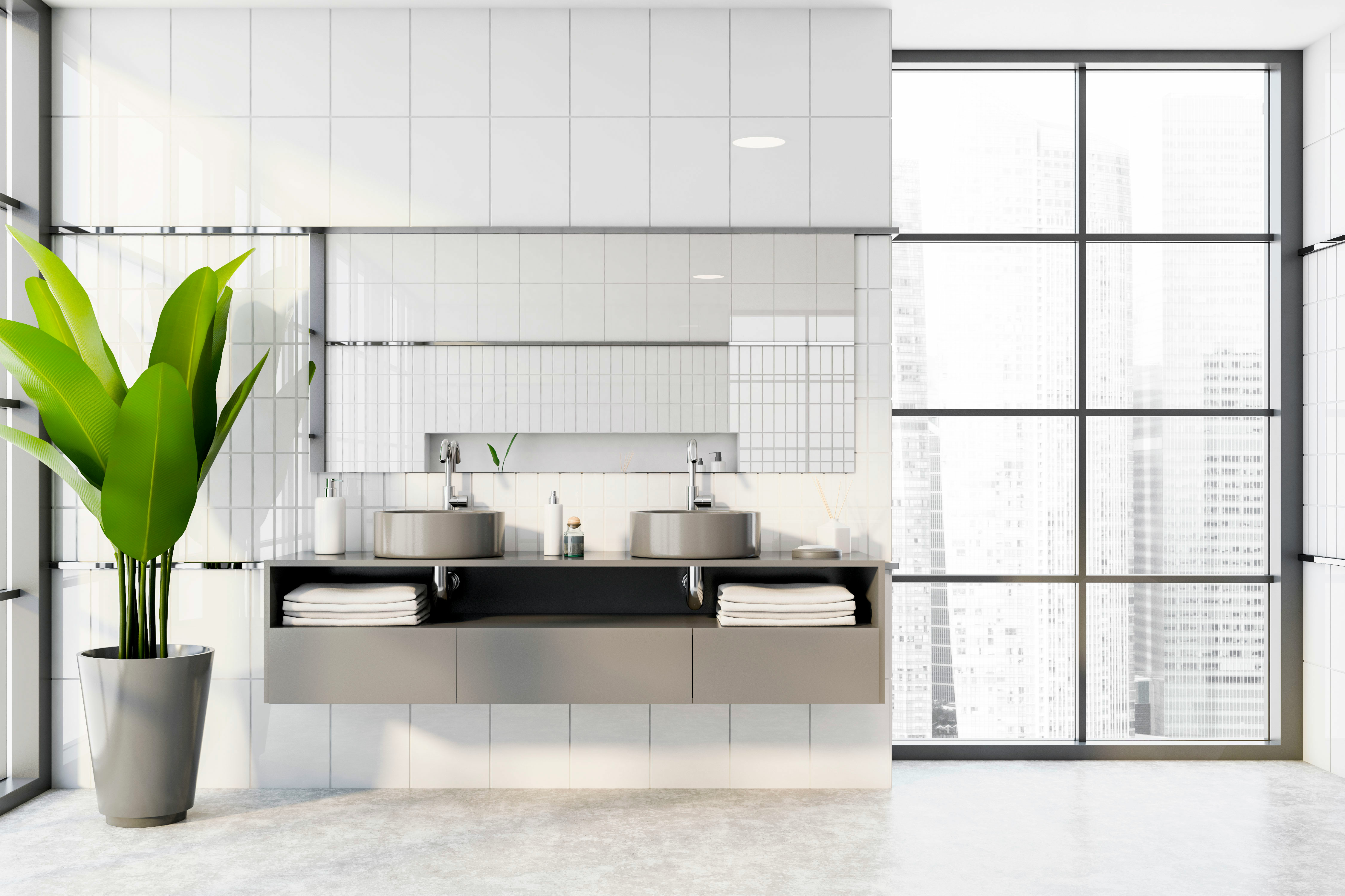 White tile bathroom interior with double sink
